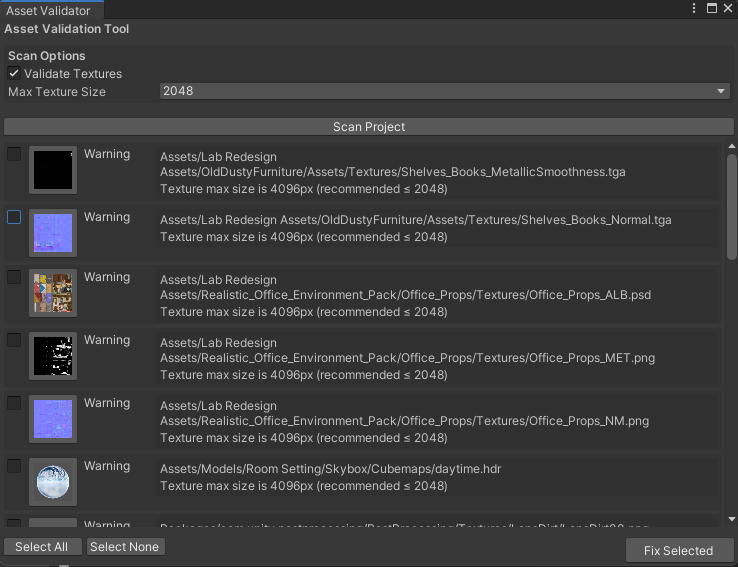 A Unity Editor tool that validates texture sizes and supports selective batch fixing to help teams maintain consistent asset performance.