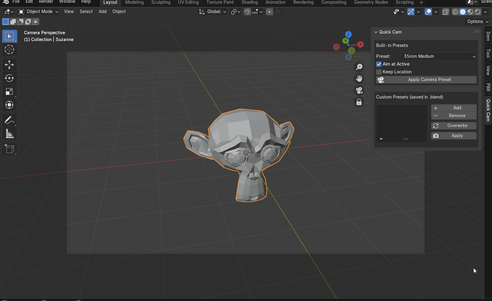 A lightweight Blender add-on that lets you instantly apply common camera setups and save your own custom presets directly inside a project for fast scene layout and shot planning.